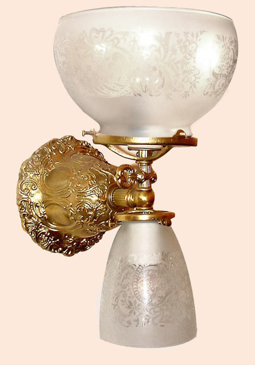 Shown in satin brass, this Victorian style "up and down" gaslight reproduction features all cast brass parts. The glass shades shown are acid etched and imported from France. The faux gas key adds realism for the total overall effect of this gas light reproduction. Great in pairs and plenty of light!